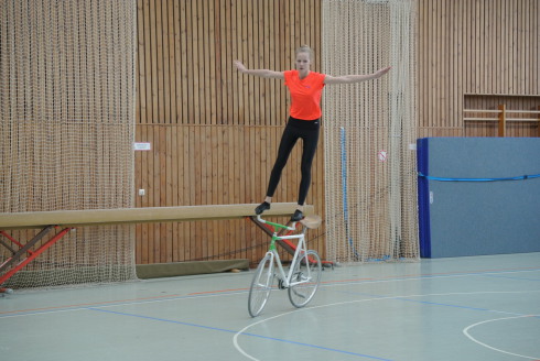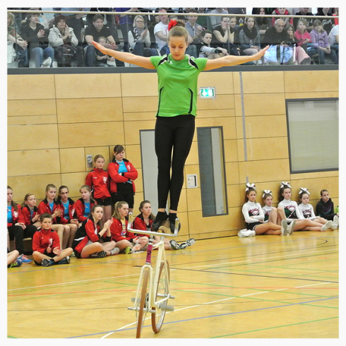 Angelina begann 2012 das Training, die ersten Wettkämpfe versprachen viel. 2015 nun hat sie es geschafft und darf als Landesmeisterin in der Altersklasse U11 bei den Ostdeutschen Meisterschaften starten. Zum Ausgleich fährt sie Einrad und tritt mit ihren Sportkameradinnen bei Events auf.